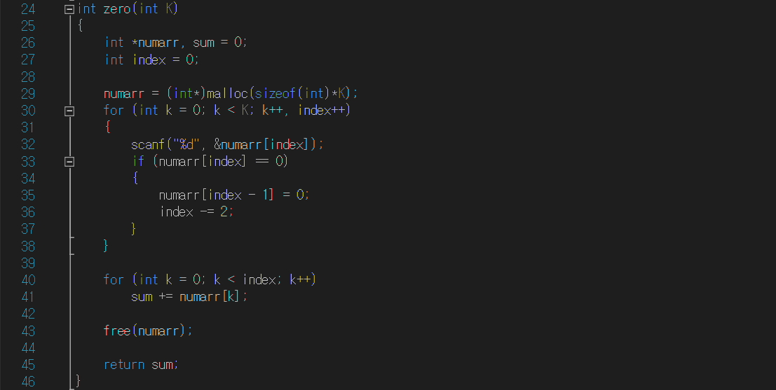 두 번째 반복문에서 k가 0부터 index전까지 증가하면서 sum에 numarr[k]값을 저장해간다. 모든 반복문이 끝나면 free함수로 numarr에 할당된 메모리를 해제하고, sum을 반환한다.