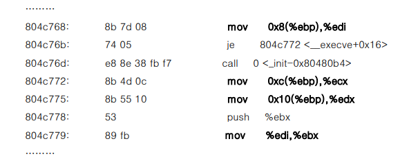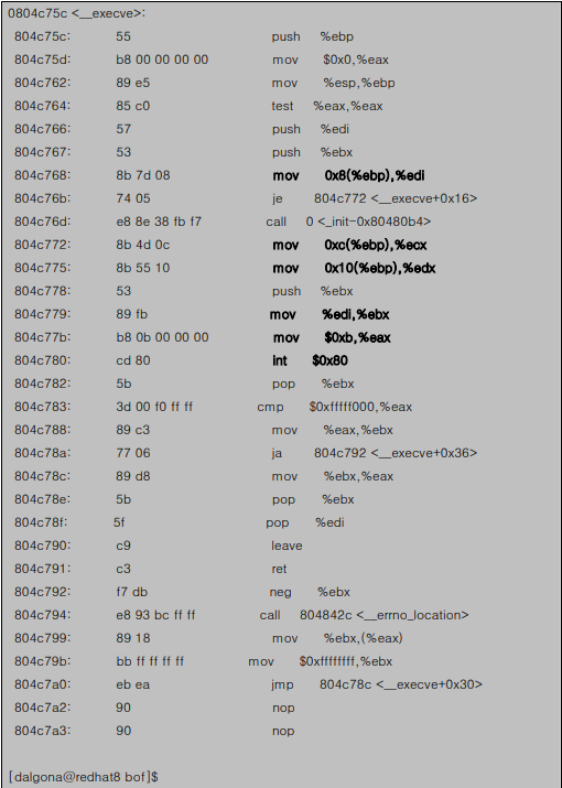 execve() 함수는 interrupt를 발생시키기 전에 범용 레지스터에 각 인자들을 집어넣어줘야 한다. 그래서 위 그림과 같은 작업을 하는데 조금 흩어져 있긴 하지만, 정리해보면 mov 0x8(%ebp), %ebx mov 0xc(%ebp), %ecx moc 0x10(%ebp), %edx를 하는 것이다.