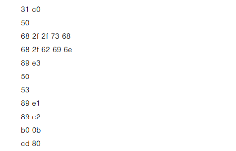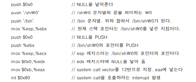 위와 같은 코드를 작성하면 된다. push '/sh\0'와 push '/bin'은 실제 어셈블리 코드가 아니다. 개념적인 의미로 적은 것이다. 이를 실제 어셈블리 코드로 만들려면 push $0x0068732f push $0x6e69622f으로 해줘야 한다. 문자를 16진수 값으로 바꾼 것으로 little endian 순서이다.