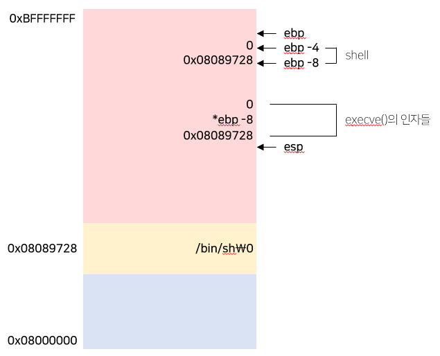- 스택에 execve()를 실행하기 위한 인자들을 제대로 배치하고
