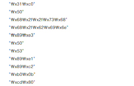 이제 남은 것은 이것을 문자열화 시키는 것이다. char형 배열에 16진수 형태의 바이너리 데이터를 전달할 것이다. 그러기 위해서는 \x90형식으로 바꿔야한다. 덤프한 코드에서 직접 만든 부분의 기계어 코드를 추출해 보면 아래와 같다.