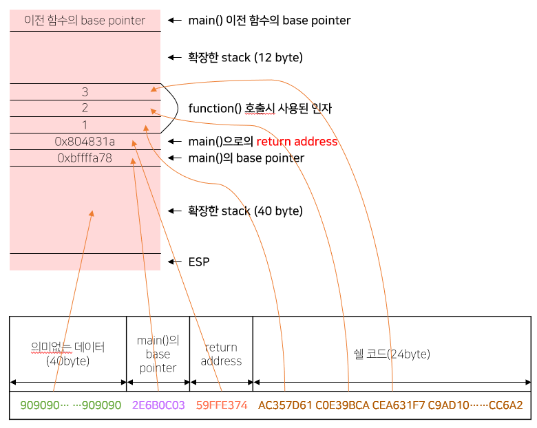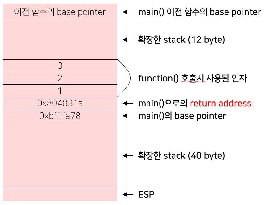 그리고 function() 함수의 인자는 function() 함수의 base pointer와 return address(main함수의 다음 명령이 있는 주소)위에 존재하게 된다. 이것은 <그림 1>에서 보는 바와 같이 main() 함수가 호출 될 때 주어지는 인자 argc, argv가 위치한 곳과 같은 배치를 갖고 있다.