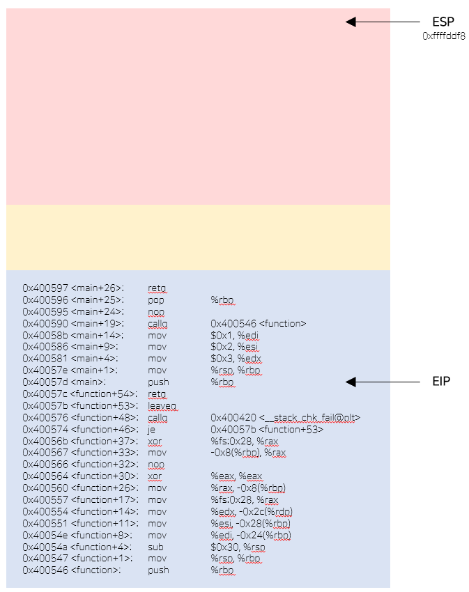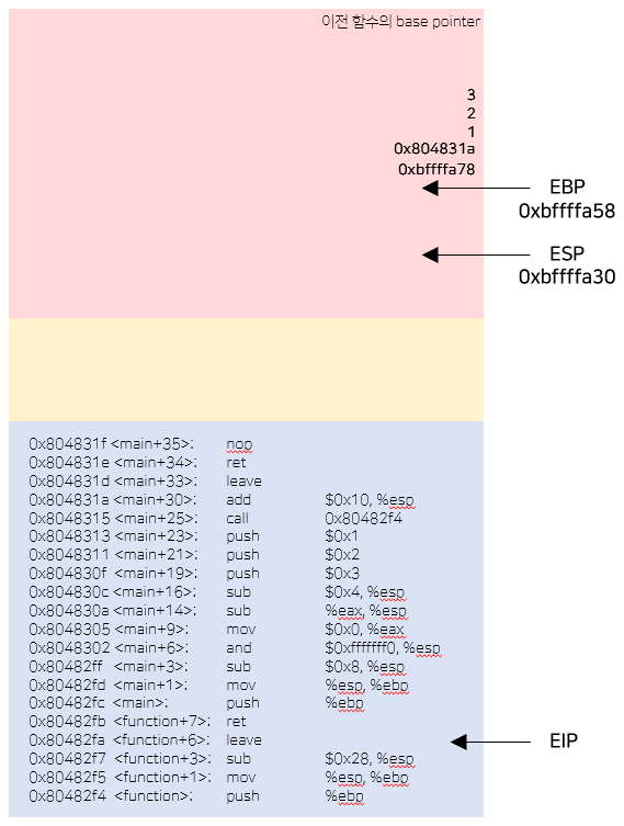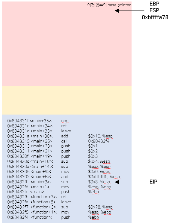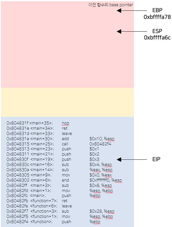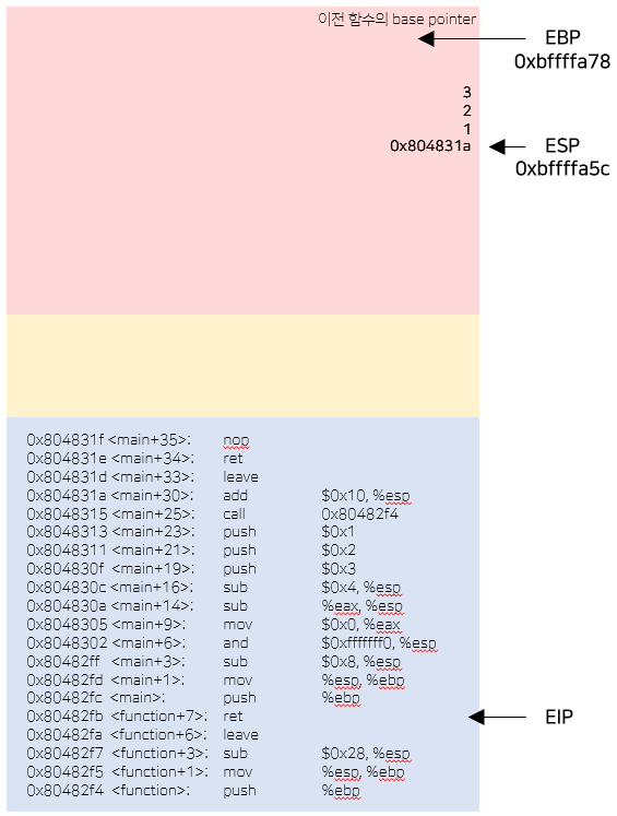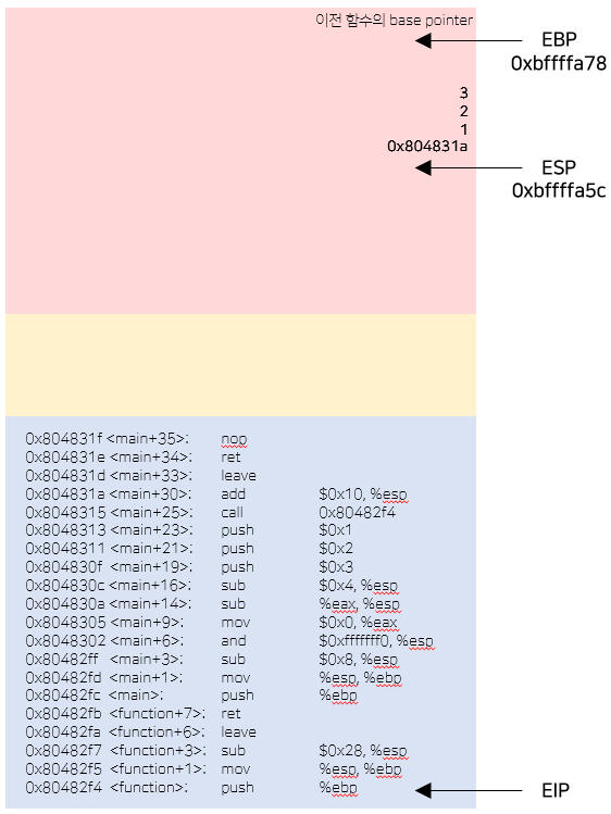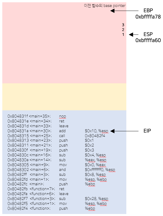 위 그림을 보면 EIP에는 function() 함수가 있는 0x80482f4 주소값이 들어가게 되고, stack에는 "add $0x10, %esp" 명령이 있는 주소값이 들어가게 된다.