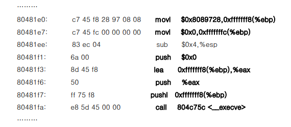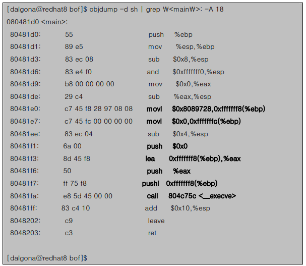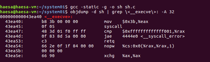 이 프로그램이 컴파일되어 생성될 바이너리 코드를 얻어야 하는데 execve() 함수 때문에 이 프로그램은 컴파일되면서 Linux libc와 링크된다. execve()의 실제 코드가 libc에 들어있기 때문이다. 따라서 execve()가 어떤 일을 하는지도 알아보기 위하여 static library 옵션을 주어 컴파일해야 한다.