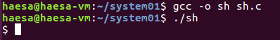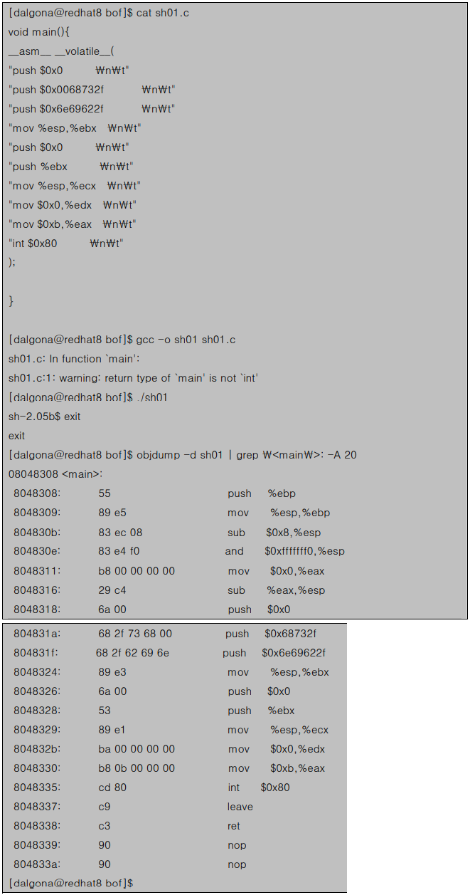 이제 이 코드가 제대로 동작하는지 컴파일 해보겠다. 이 코드는 C 프로그램 내에 인라인 어셈블(inline assemble)로 코딩할 것이고 main() 함수 안에 들어갈 것이기 때문에 함수 프롤로그가 필요 없다. 최종적으로 완성한 sh01.c의 코드는 다음과 같다.