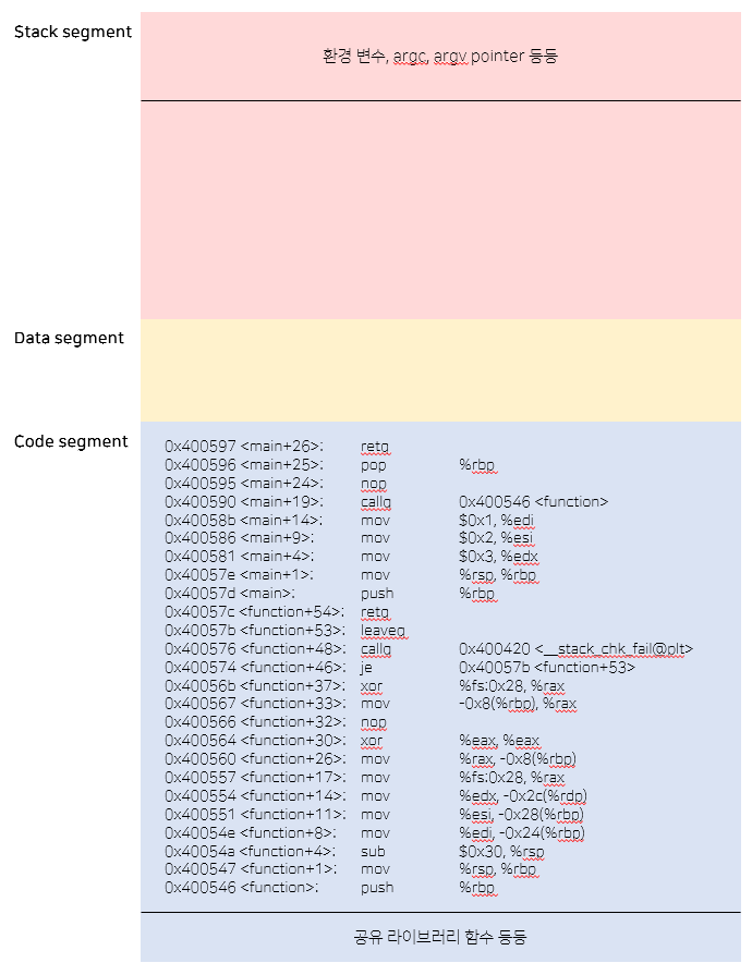 이 값들이 왜 여기에 들어가는지는 <그림 1>에서 argc, argv가 위치한 자리와 밑에서 설명할 function()의 프롤로그가 끝난 다음의 stack의 모습을 보면 이해가 될 것이다.