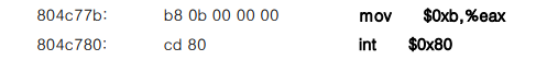 그런 다음 eax 레지스터에 11을 넣고 int $0x80을 하였다. 이 과정이 system call 과정이다. int $0x80은 운영체제에 할당된 인터럽트 영역으로 system call을 하라는 뜻이다. int $0x80을 호출하기 이전에 eax 레지스터에 시스템 콜 벡터(vector)를 지정해 줘야 하는데 execve()에 해당하는 값이 11(0xb)인 것이다.