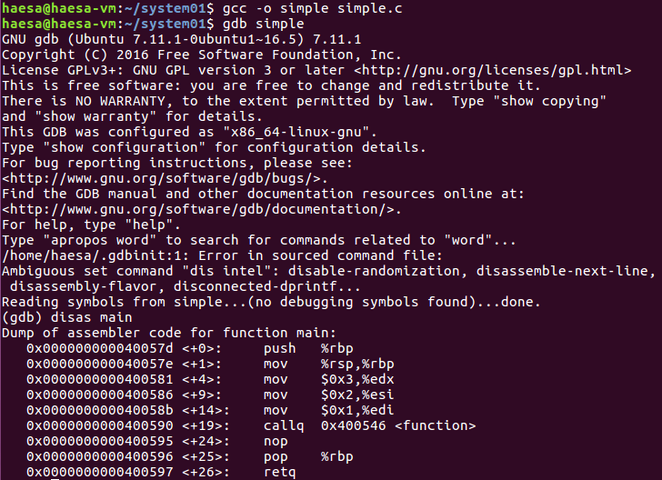 이제 simple.c 프로그램이 컴파일 되고, 실제 메모리 어느 위치에 자리하게 될지 알아보기 위해 gdb를 이용할 것이다. gdb를 이용해서 segment의 logical address를 알아보자.