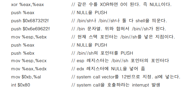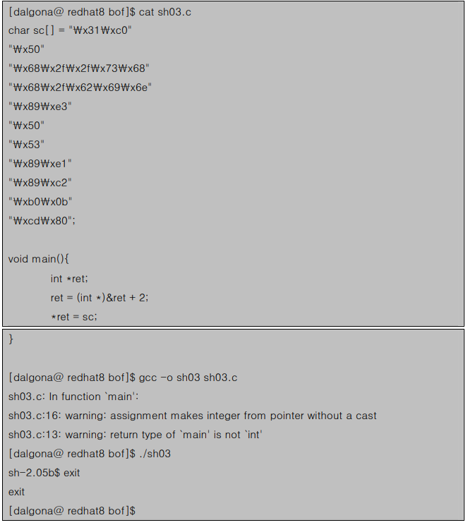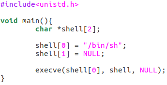 쉘 상에서 쉘을 실행시키려면 '/bin/sh'이라는 명령을 내리면 된다. 마찬가지로 쉘 실행 프로그램 역시 이 명령을 내리는 것과 똑같은 일을 하도록 해주면 된다. 아래의 코드를 보자.