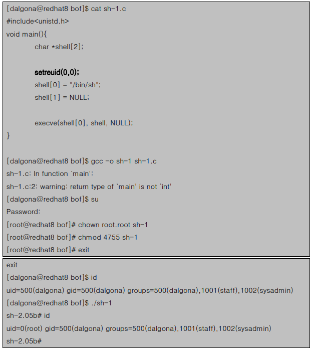 공격자는 buffer overflow 공격이 성공한 후 보다 많은 권한을 얻고 싶어 할 것이다. setuid 비트가 set되어 있는 프로그램을 이용하면 root 권한을 얻을 수 있다. 그럴러면 setuid 비트가 set되어 있는 프로그램을 오버플로우시켜서 쉘 코드를 실행시키고 루트의 쉘을 얻어낼 방법이 필요하다.