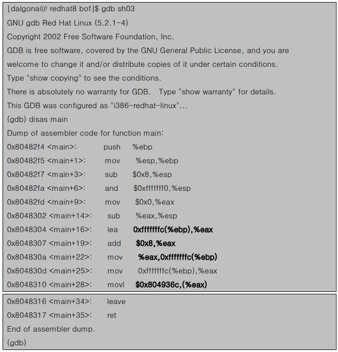먼저 ebp -4 byte 지점의 address를 eax 레지스터에 넣는다. 그 다음 그 address에 8을 더한다. 이것은 sh03.c에서