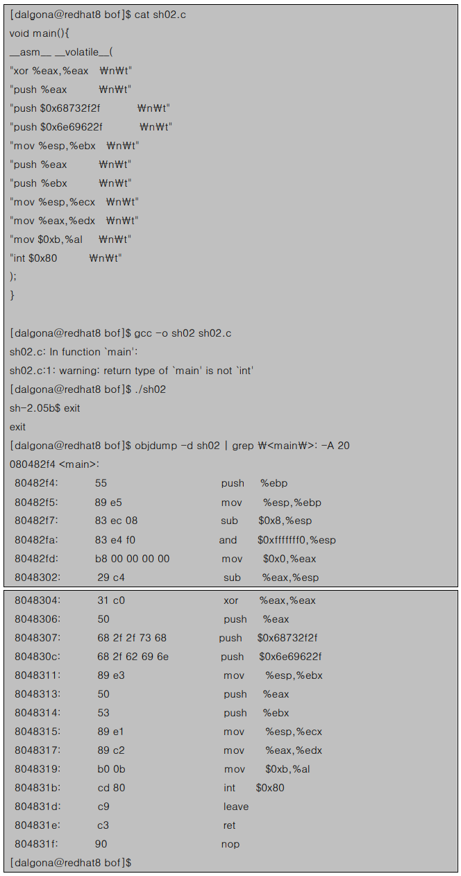 한편, 더 완벽한 쉘 코드를 만들기 위해 exit(0)가 필요할 수 있다. 이것은 공격자가 overflow 공격을 수행하고 난 뒤 프로그램을 정상적으로 종료하기 위해서다. 만약 정상 종료가 되지 않는다면 에러 메세지가 발생하여 관리자에게 그대로 전달될 수도 있다.