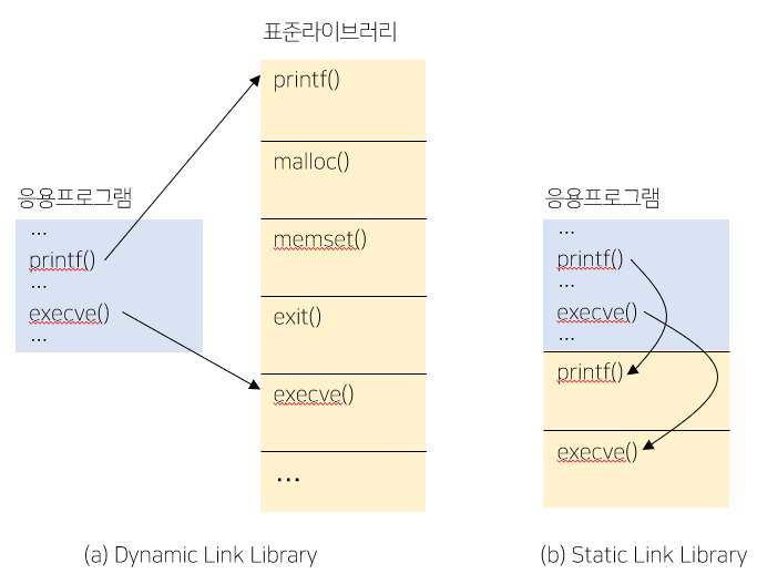 이러한 저장 공간의 낭비를 막기 위해 운영체제는 많이 사용되는 함수들의 기계어 코드를 라이브러리 형태로 자신이 가지고 있다. 리눅스에서는 libc라는 라이브러리가 있고 실제 파일로는 .so 혹은 .a라는 확장자를 가진 형태로 존재한다. 윈도우에서는 DLL(Dynamic Link Library) 파일로 존재한다.
