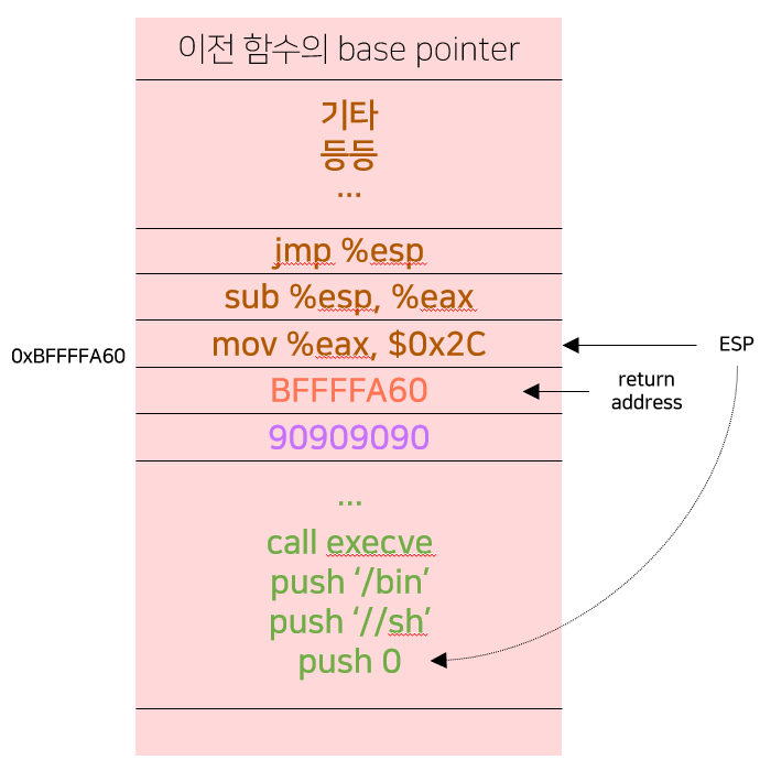 그 공간에 쉘 코드를 넣었다면 EIP 레지스터가 해당 영역에 있는 명령을 가리킬 수 있도록 해야 한다. return address를 그 공간의 주소로 직접 지정하면 좋겠지만, 해당 명령어가 있는 주소를 정확히 알아내는 것은 매우 어렵다. 따라서 간접적으로 그 곳으로 명령 수행 지점을 변경해 주는 방법을 사용한다.