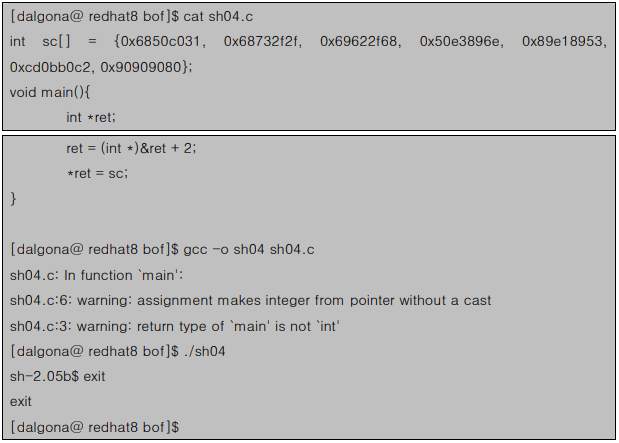 쉘 코드를 저장할 변수를 int형으로 만드는 방법도 있다. 유의할 점은 little endian 순서로 정렬해야 하며 int형이므로 4byte 단위로 만들어 줘야 한다. 이렇게 만들어진 쉘 코드 실행 프로그램은 다음과 같다.