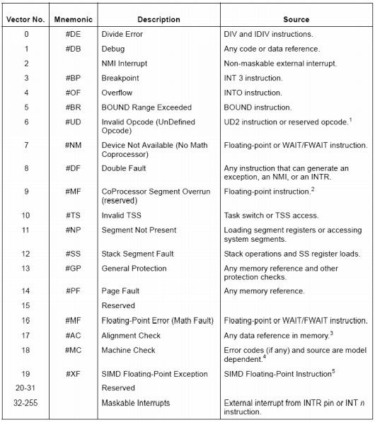 32bit Intel Architecture에서의 인터럽트 및 Exception은 다음과 같다.