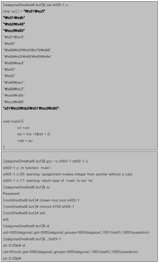 이렇게 해서 프로그램 소유자의 권한으로 쉘을 실행시키는 쉘 코드를 생성할 수가 있다.