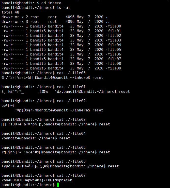 그 결과 -file00부터 -file09까지의 파일이 존재한다는 것을 알게 되었고, "cat ./파일명" 명령어로 다음 레벨의 게임 패스워드가 나올 때까지 파일 내용을 출력했다. 명령어를 계속 실행하다 보면 -file07에서 패스워드가 나온다.