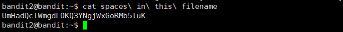 level 2에 접속 후 spaces in this filename 파일을 읽기 위해 cat spaces까지 입력 후 tab키 자동완성으로 파일명을 찾았다.