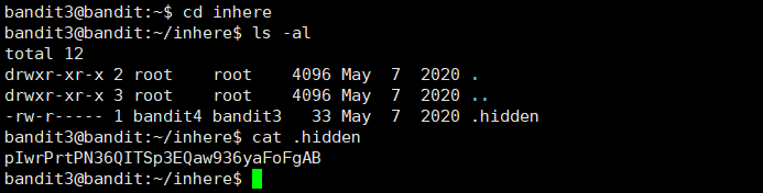 level 3에 접속 후 inhere directory로 이동하고, ls -al 명령어로 해당 디렉토리의 모든 파일 리스트를 출력했다.