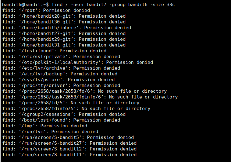 level 6에서 다음 레벨로 가는 패스워드는 소유권자가 bandit7이고 그룹소유는 bandit6, 파일 크기는 33bytes인 파일안에 있다. 따라서 find 명령어로 표현식을 써서 해당 파일을 찾았다. cat으로 해당 파일을 출력해서 다음 레벨로 가는 패스워드를 알아냈다.