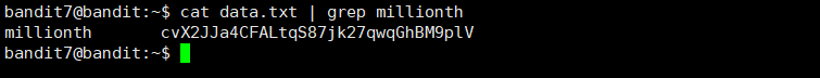 level 7에 접속하고, data.txt 파일에 millionth이 포함된 줄을 출력하기 위해 파이프를 이용했다. 그 결과 다음 레벨로가는 패스워드를 찾을 수 있었다.