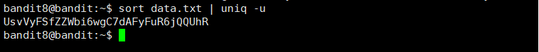 level 8에 접속 후 data.txt에 들어있는 패스워드를 찾기 위해 uniq에서 u옵션을 사용했다. 힌트: 패스워드는 data.txt에 한 번 등장
