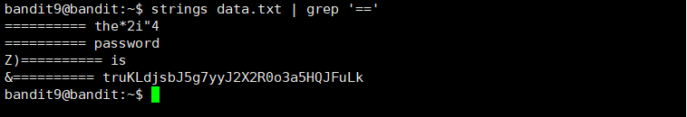 level 9에 접속 후 grep 명령어로 data.txt에서 '=='가 포함된 문자열을 출력하려 했지만, data.txt가 이진파일이라 명령어가 제대로 실행되지 않았다. 따라서 strings 명령어로 data.txt를 문자열로 읽은 다음 grep 명령어를 사용했다. 그 결과 화면에 위 사진과 같이 출력됐고 패스워드를 하나하나 입력해보기로 했다.
