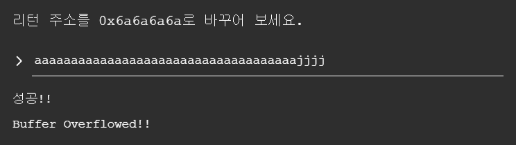 다음은 위 예제의 리턴 주소를 0x6a6a6a6a로 변경하는 실습이다. (16진수로 6a는 알파벳 j)