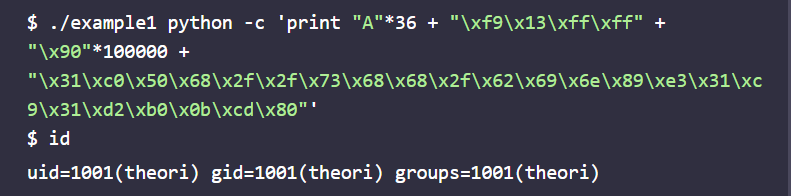 새롭게 만든 코드로 다시 익스플로잇을 시도하면 성공적으로 셸이 실행된다.