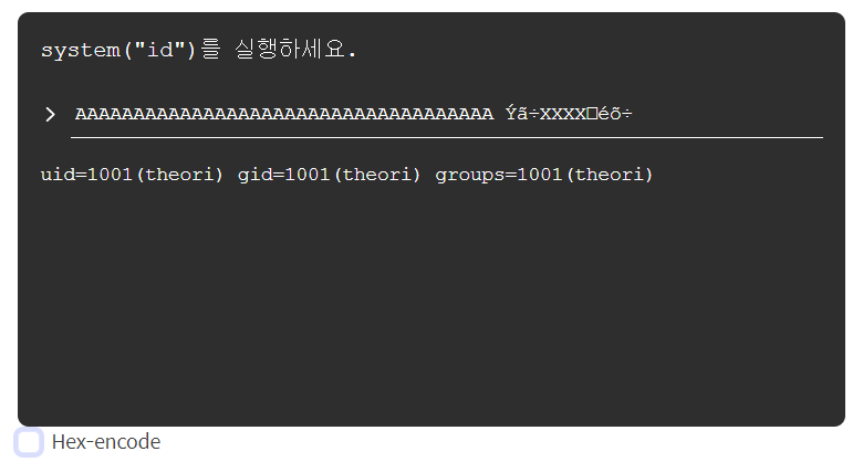 system("id")를 실행해라.