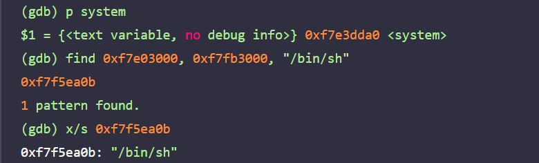 이제 system 함수의 주소와 /bin/sh 문자열의 주소를 알아내야 한다. gdb로 프로그램을 실행한 후 print 명령어를 사용하면 system 함수의 주소를 찾을 수 있다. 그리고 find 명령어로 libc.so.6의 라이브러리 주소와 찾고 싶은 메모리의 값을 입력으로 주면 해당 라이브러리에 존재하는 /bin/sh 문자열의 주소를 찾을 수 있다.