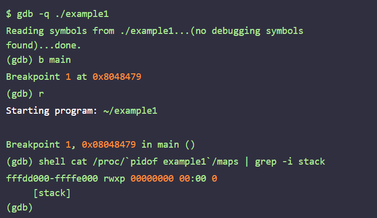 readelf를 사용하지 않고 확인하는 방법도 있다. 실행되고 있는 바이너리의 메모리 맵에 있는 권한을 확인하면 된다. NX bit가 적용되어 있지 않은 바이너리의 스택 영역 권한을 보면 rwx인 것을 볼 수 있다.