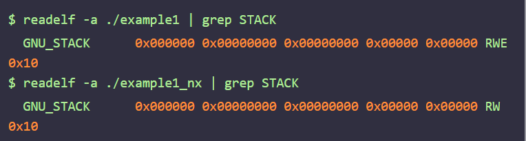 ELF 바이너리 분석 도구인 readelf를 사용하면 NX bit 적용 여부를 쉽게 확인할 수 있다. readelf -a 'path'의 출력 결과에 대해 grep을 통해 "STACK" 문자열을 검색하면 스택 메모리의 권한을 볼 수 있다. NX bit가 적용되어 있지 않은 바이너리는 RWE(읽기, 쓰기, 실행) 권한으로, NX bit가 설정되어 있는 바이너리는 RW(읽기, 쓰기) 권한으로 설정되어 있다.