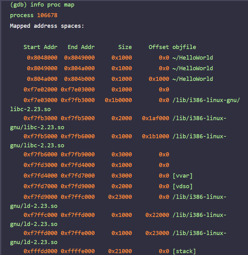HelloWorld.c 예제를 gdb를 사용해서 자세히 보면 libc.so.6 라이브러리의 코드영역 주소가 0xf7e03000 ~ 0xf7fb3000이고, printf 함수 이외의 다른 함수들이 메모리에 존재한다는 것을 확인할 수 있다.
