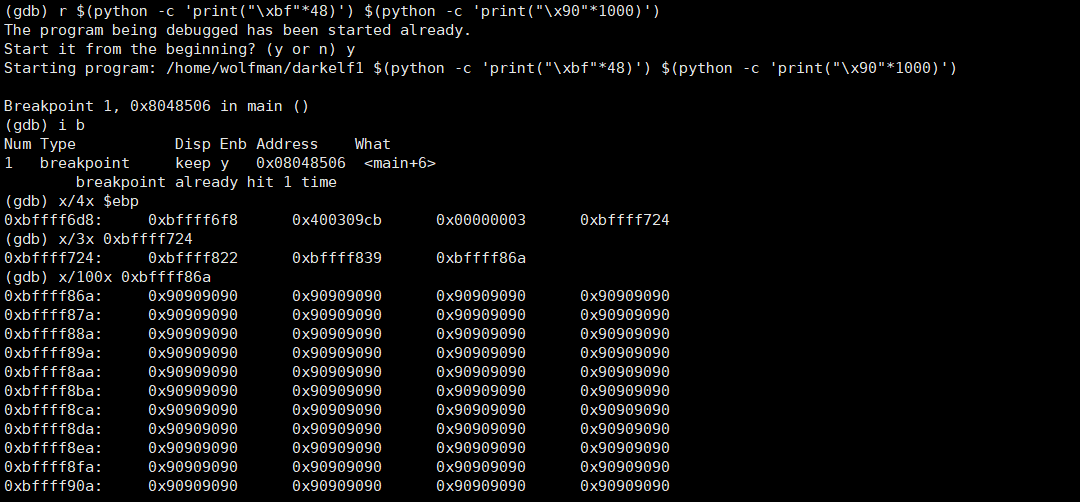 정말로 맞는지 확인하기 위해서 메모리의 값을 출력해봤다. \x90가 잘 들어간 것을 확인했다. 이중에서 적당한 주소를 골라 공격에 사용하겠다. 나는 \xbffff87a를 선택했다.