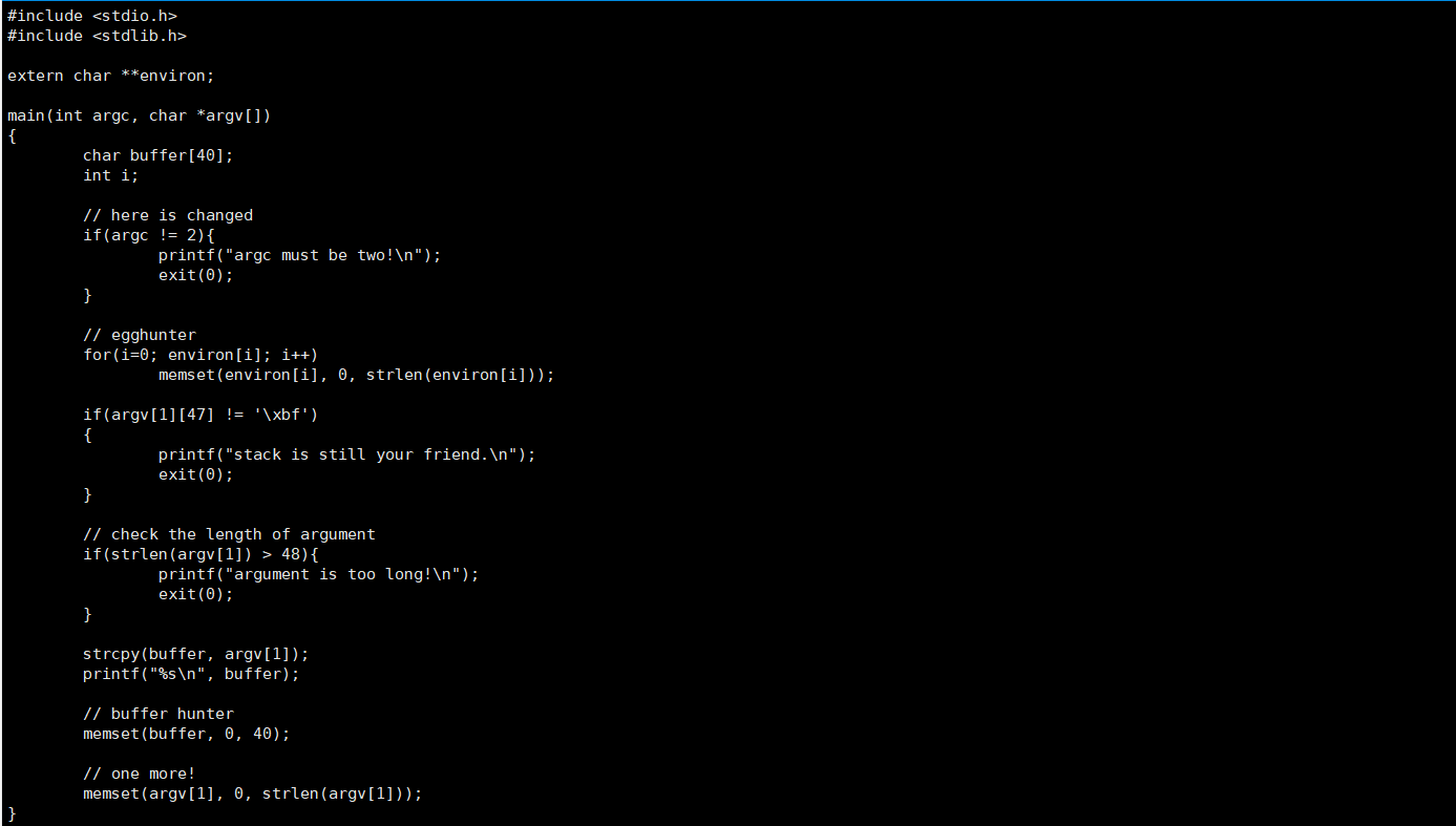 here is changed 주석을 보면 이번엔 인자의 개수를 2개로 제한하는 것을 알 수 있다. 즉 argv[2]를 이용할 수 없다는 뜻이다. 맨 마지막에 one more! 주석에는 argv[1]의 값을 0으로 초기화 해주는 것을 볼 수 있다. 이렇게 되면 쉘코드를 argv[1], arg[2]에 넣을 수 없다. 하지만 아직 초기화 되지 않은 공간이 존재한다. argv[0]에 쉘코드를 넣어서 공격해보자.