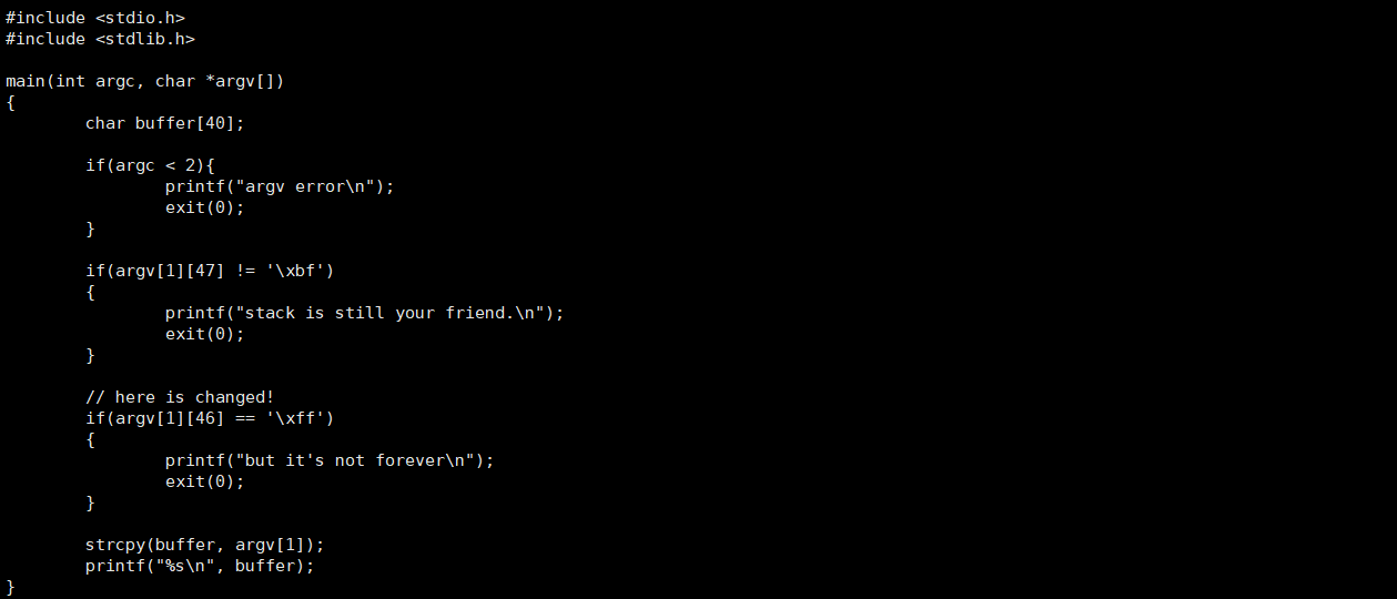 코드를 순차적으로 보면 인자의 개수에는 제한이 없고, ret에 덮을 주소는 스택 영역의 주소여야 하며, argv[1][46], 즉 return address의 상위 2번째 바이트가 \xff가 아니어야 한다. 이로 봤을 때 argv[2]에 쉘코드를 삽입하고, ret 영역에 argv[2]의 주소를 덮어씌우면 될 것 같다. 이때 return address의 상위 2번째 바이트가 \xff가 아니어야 한다는 것은 더 낮은 메모리 주소를 가져야 한다는 뜻이다. 스택의 특성상 낮은 메모리 주소를 가지려면 스택프레임의 크키가 커져야 한다. 따라서 쉘코드에 nop를 10만개 삽입해서 공격을 진행해봤다.