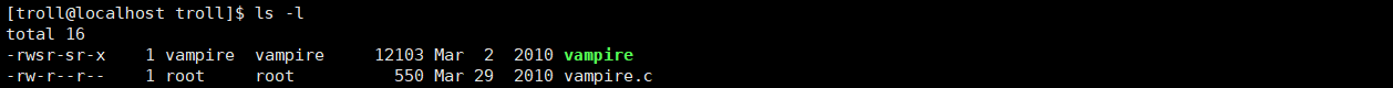 파일 목록을 살펴보면 vampire.c 파일이 있는 것을 볼 수 있다. cat명령으로 출력시켜보자.